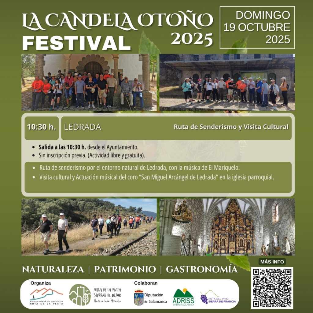 A las 10:30 h, desde el Ayuntamiento, comenzará una ruta de senderismo por el entorno natural de Ledrada, amenizada con la música tradicional de El Mariquelo